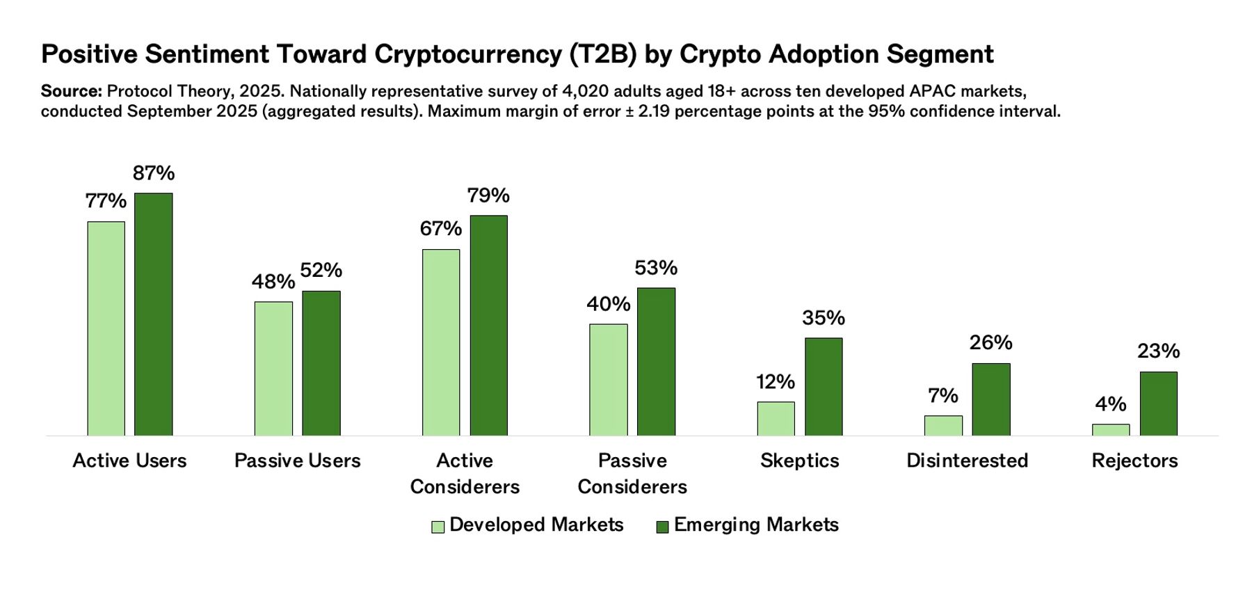 Across developed markets, sentiment toward cryptocurrency varies sharply by stage.