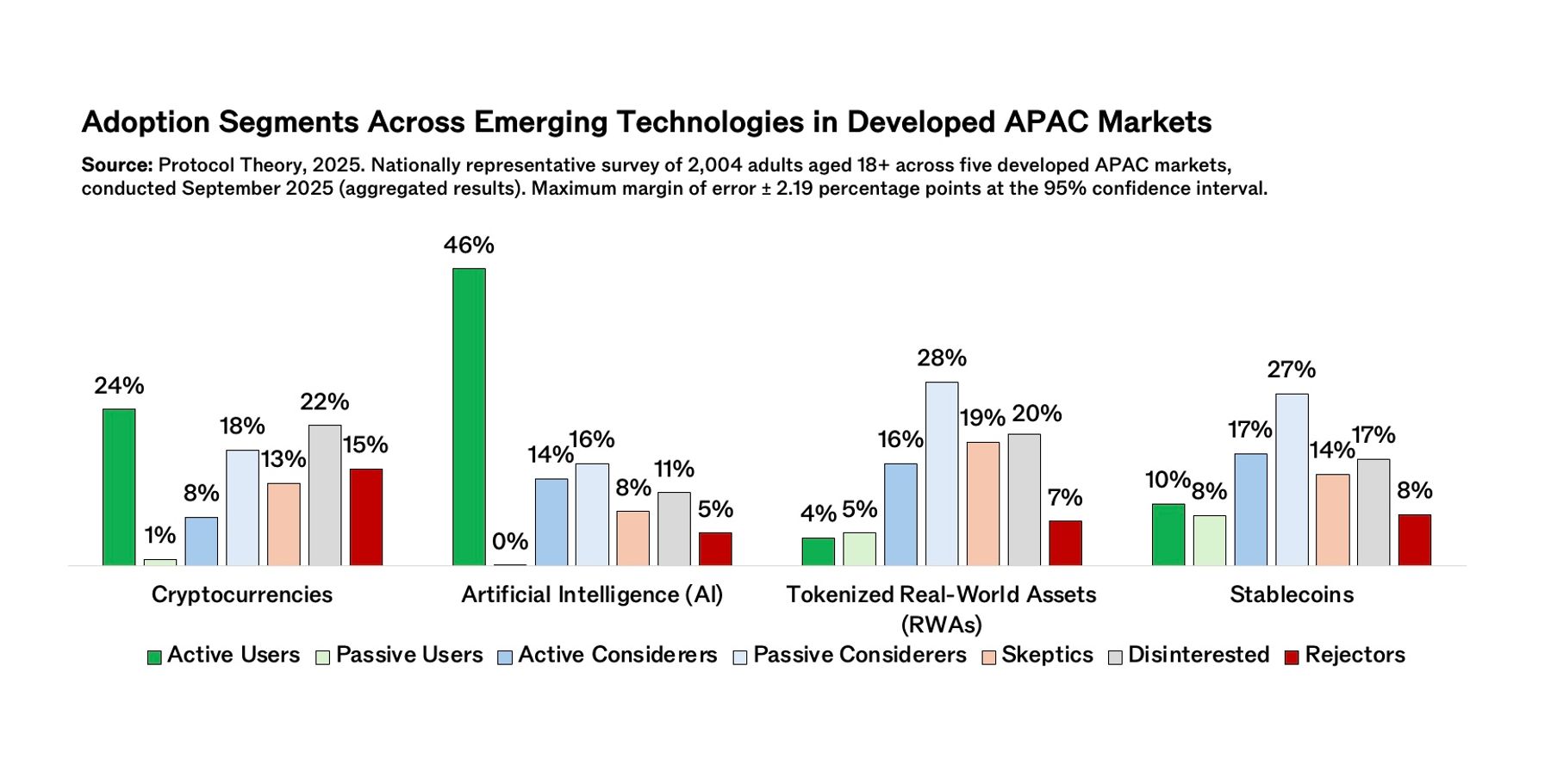 Applying the framework across categories shows how adoption takes different forms depending on the technology. Artificial Intelligence (AI) has by far the largest proportion of Active Users, reflecting its accessibility and practical integration into daily life. Cryptocurrencies, while more established, display a more polarized profile—one marked by a strong active base but also sizeable groups of Skeptics, Disinterested, and Rejectors.