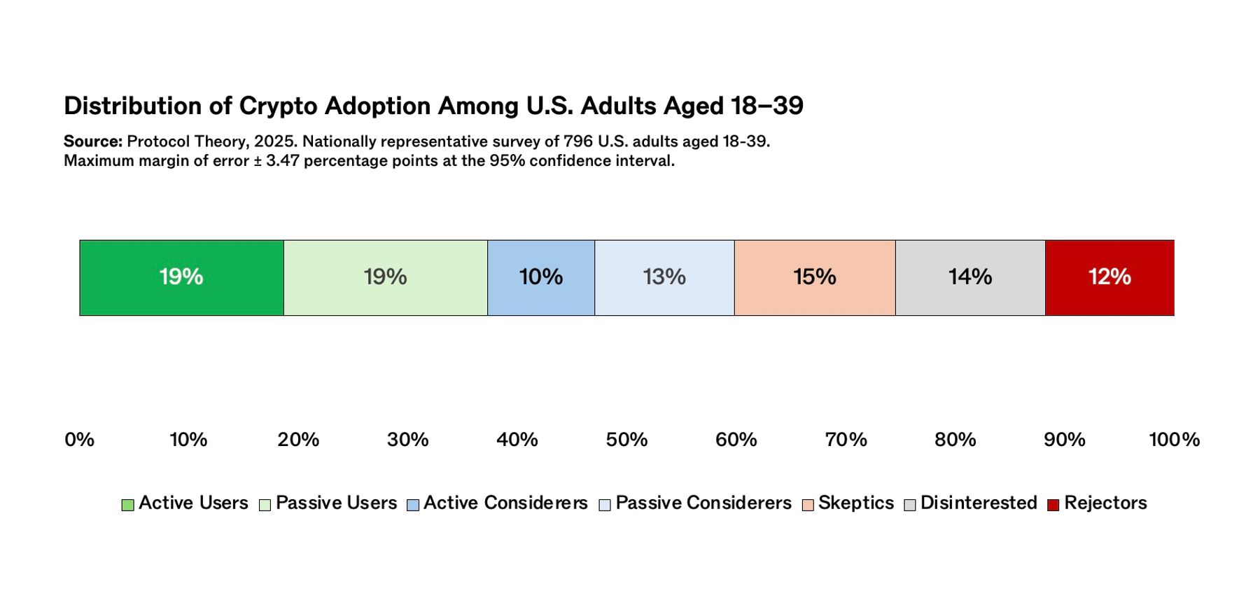 Stablecoins and Tokenized Real-World Assets (RWAs), in contrast, are dominated by Considerers, particularly Passive Considerers, indicating widespread curiosity yet limited participation. These categories have considerable potential energy in the market, but adoption remains constrained by uncertainty, usability, and perceived relevance.