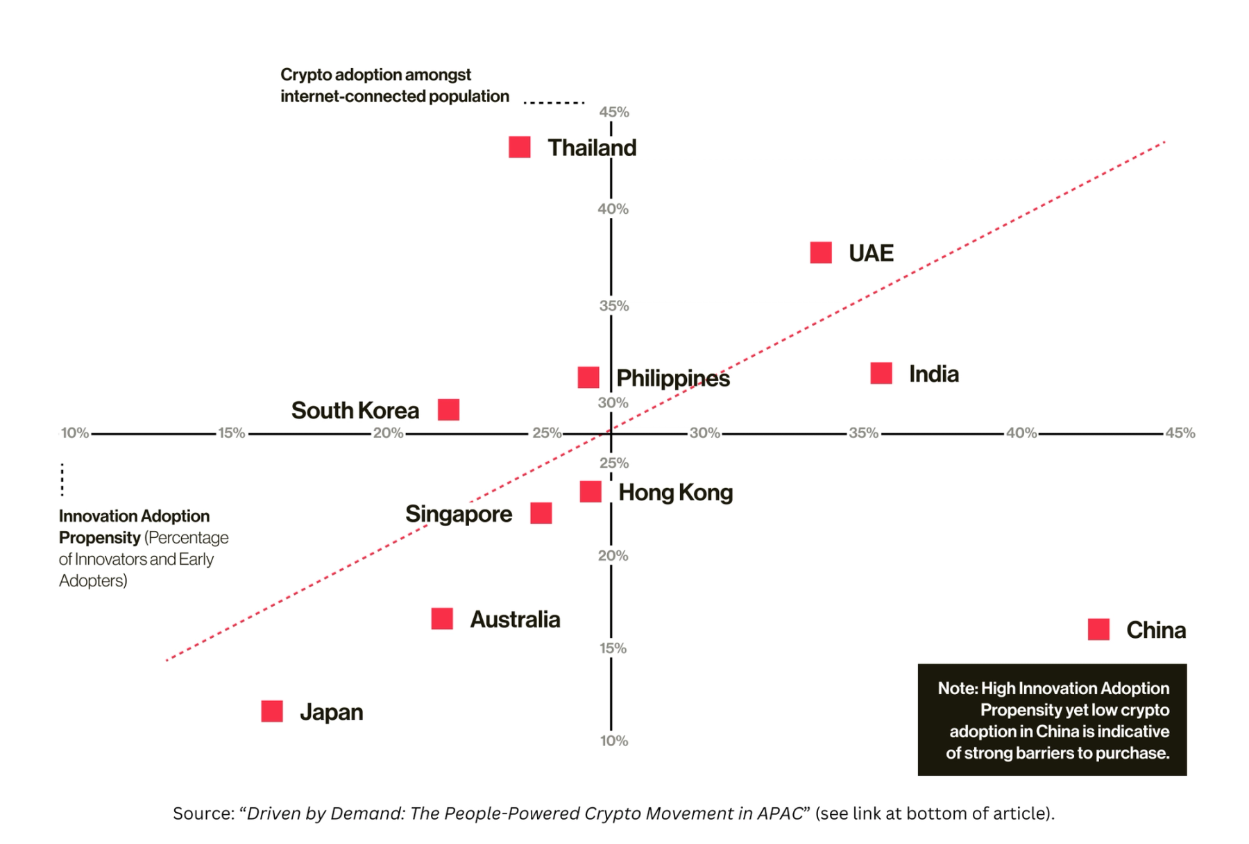 Furthermore, China’s Innovation Adoption Propensity—the percentage of Innovators and Early Adopters that exist within the country’s general population, and one of the strongest predictors of overall cryptocurrency adoption—stands at 43%, considerably higher than any of the other nine APAC markets we surveyed (27% regional average).